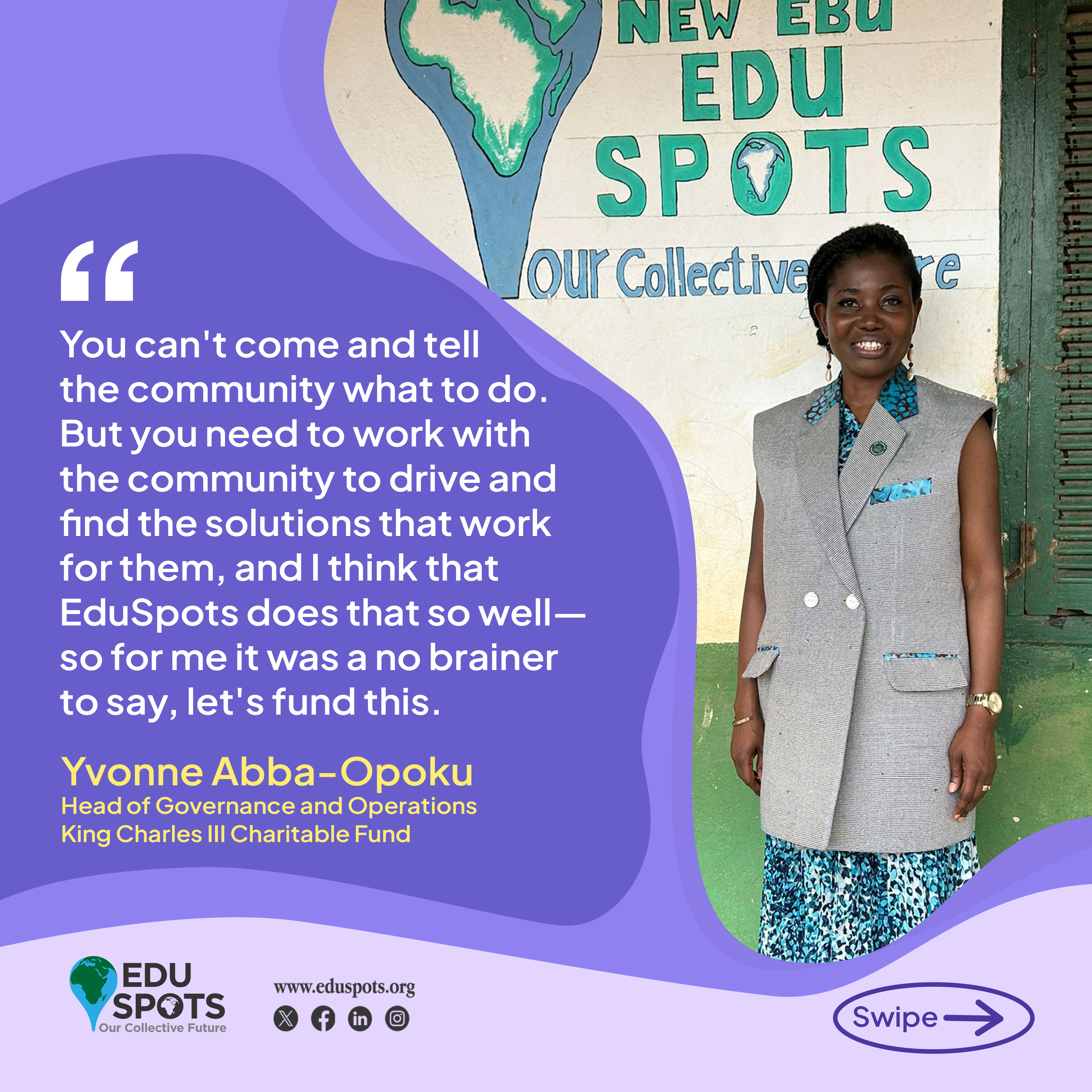 “You can’t come and tell the community what to do. But you need to work with the community to drive and find the solutions that work for them, and I think that EduSpots does that so well – so for me it was a no-brainer to say, let’s fund this.” – Yvonne Abba-Opoku