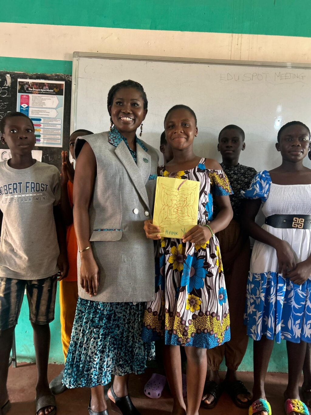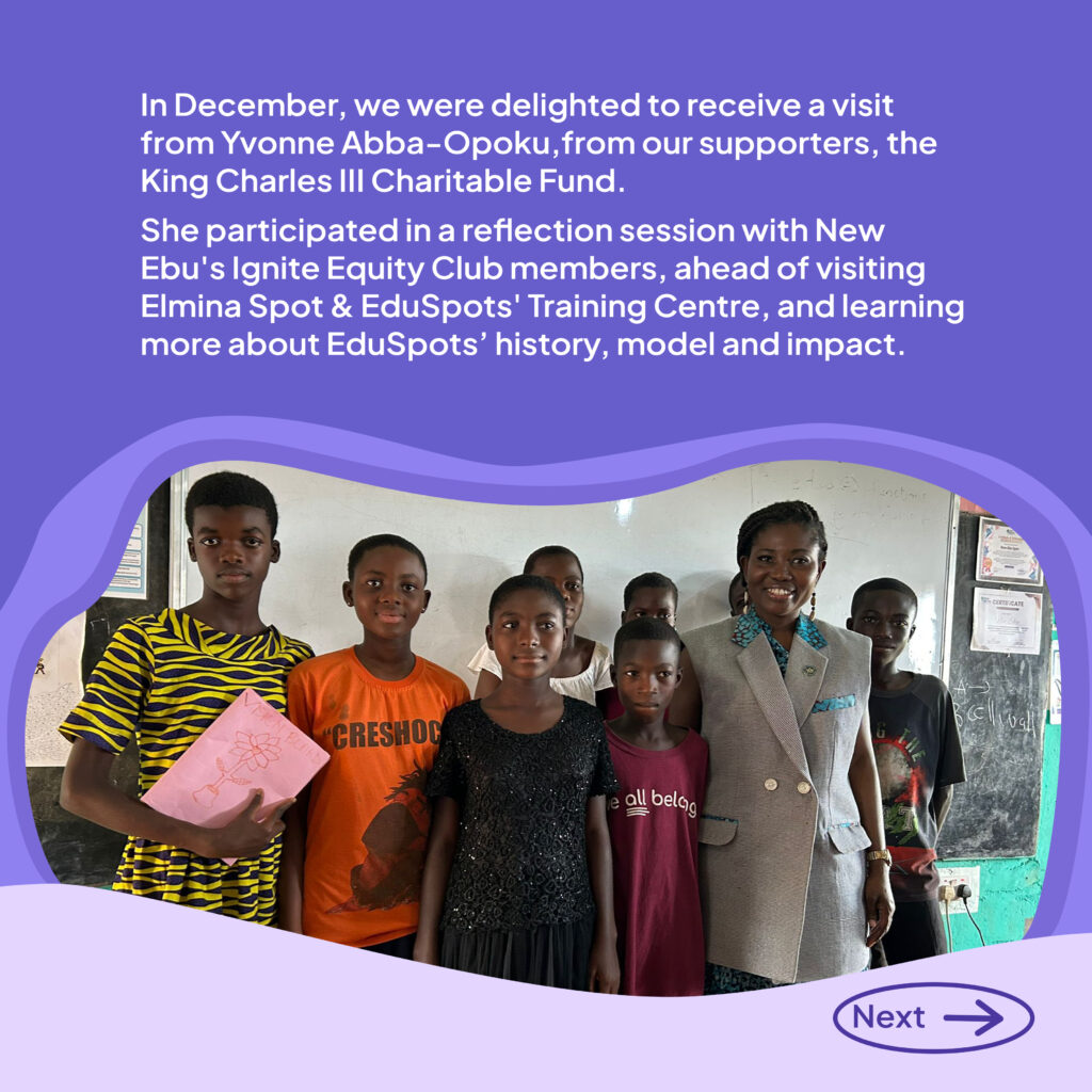 Following the visit, Yvonne said, “Renewed thanks for an inspiring and extremely worthwhile visit to EduSpots in New Ebu and Elmina. I was deeply impressed by your dedication and commitment to driving community-led education at both locations.”