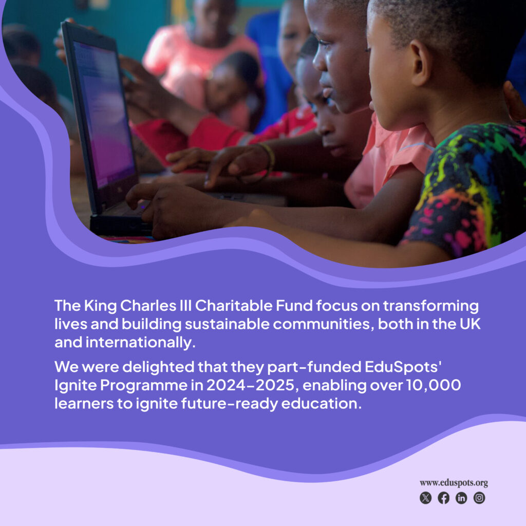 In 2025, the King Charles III Charitable Fund awarded EduSpots a grant to support its work in igniting digitalised community-led education in 50 underserved communities in Ghana through the Ignite Programme.