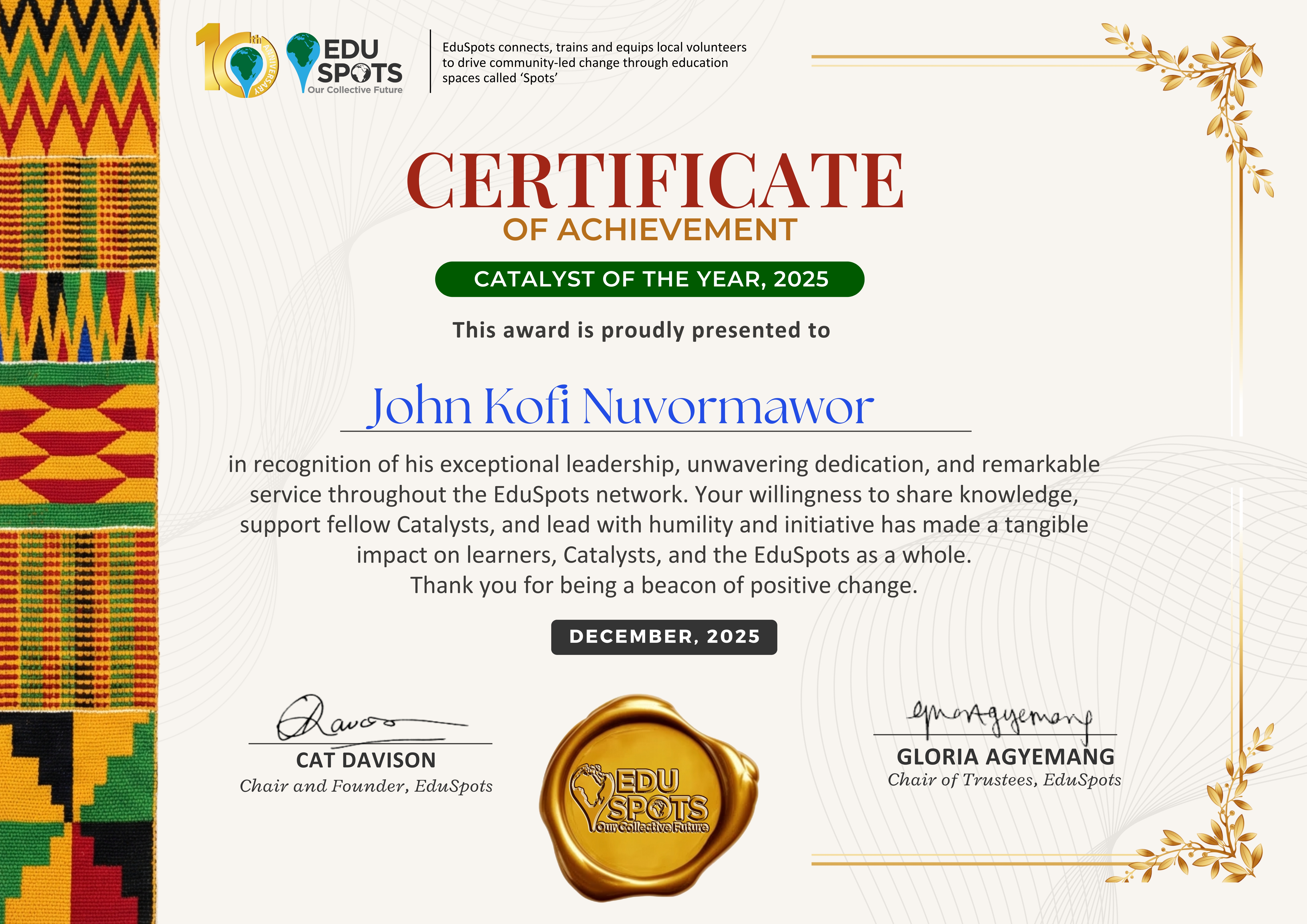 This recognition has strengthened his resolve to serve further. Inspired by the trust placed in him, John has applied for a position on the Catalyst Committee, where he hopes to represent fellow Catalysts, amplify their voices, and support them to lead meaningful change in their communities.