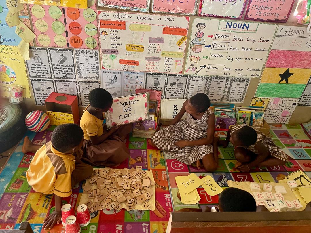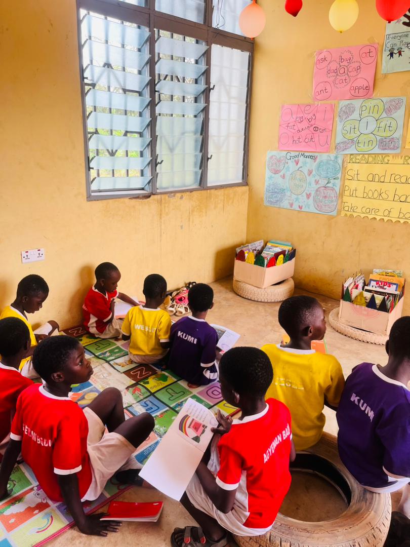 This learning was quickly put into practice through the February monthly challenge (project-based learning) with Sparks (learners). In communities such as Ho-kpenoe, Abutia, Aboabo No. 4, and Dadwen, Sparks and Catalysts worked together to create special reading corners. They used locally available materials like mats, cushions, and even old tyres. These spaces were designed to feel calm and welcoming, so children could relax and enjoy reading.